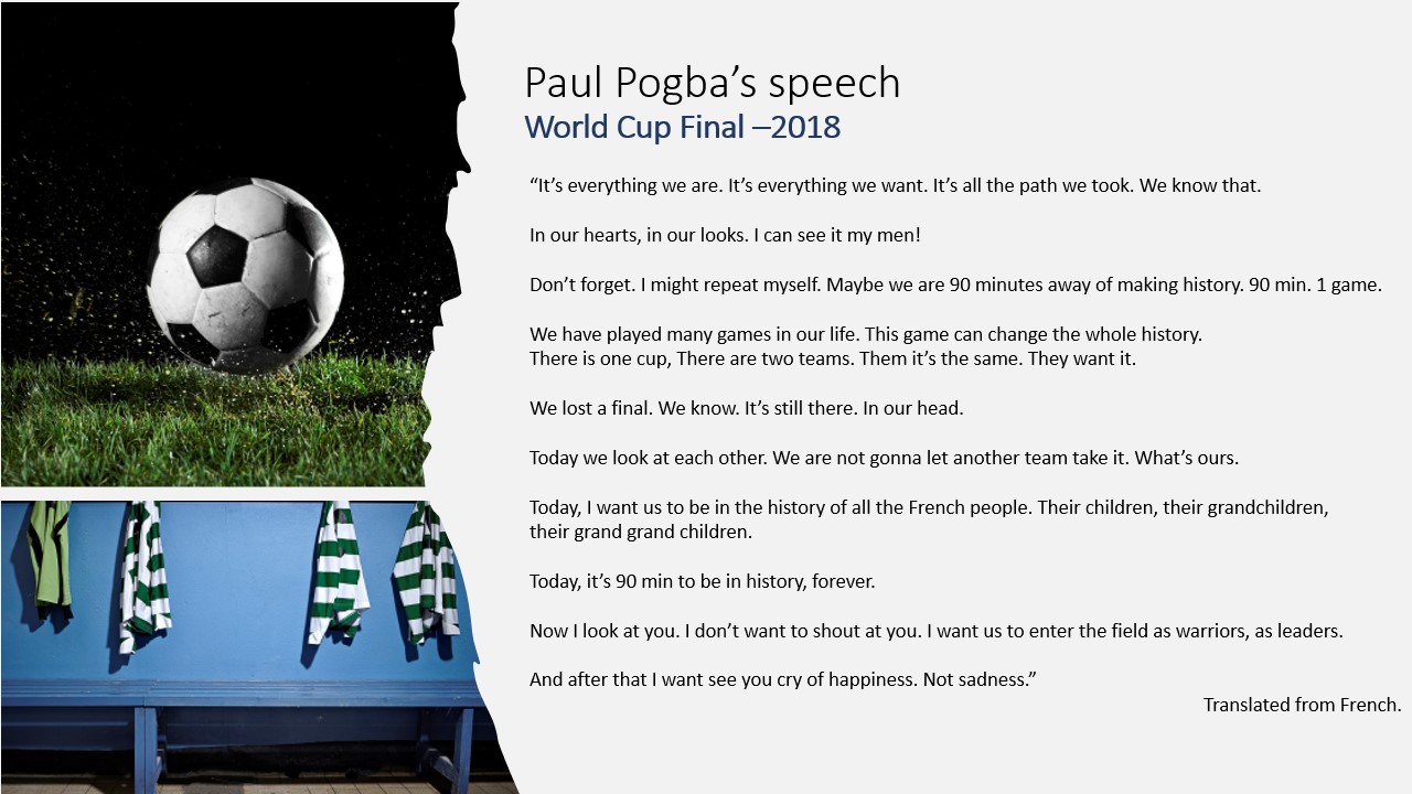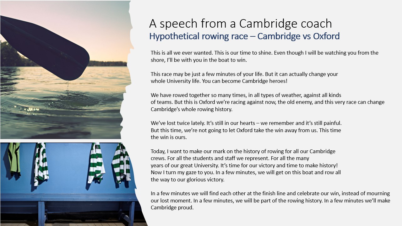 An example of that is a speech given in the football locker rooms of the French National team, before the World Cup Final. Paul Pogba, the captain at the time gave a speech to motivate his team. We translated this speech from French to English and identified a YouTube video of it. However, when looking closely it became apparent that the video did not have the right permissions and therefore, we needed to contact Paul Pogba to ask for his permission to reuse the content. Given the impossible nature of this task, and the tight launch deadline, I consulted with the team and then decided to rewrite this speech as a hypothetical scenario, inspired by Pogba’s words, but not infringing on the copyright of his speech. The result was a speech based on a hypothetical Cambridge-Oxford rowing race, which felt a lot more relevant to our Cambridge brand. We achieved the same aim, without violating copyright laws. An example can be seen in the interaction that follows. Please slide the line to compare the two images or download the PDF file which contains the text.