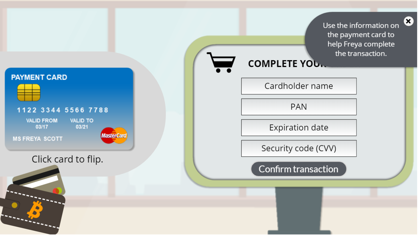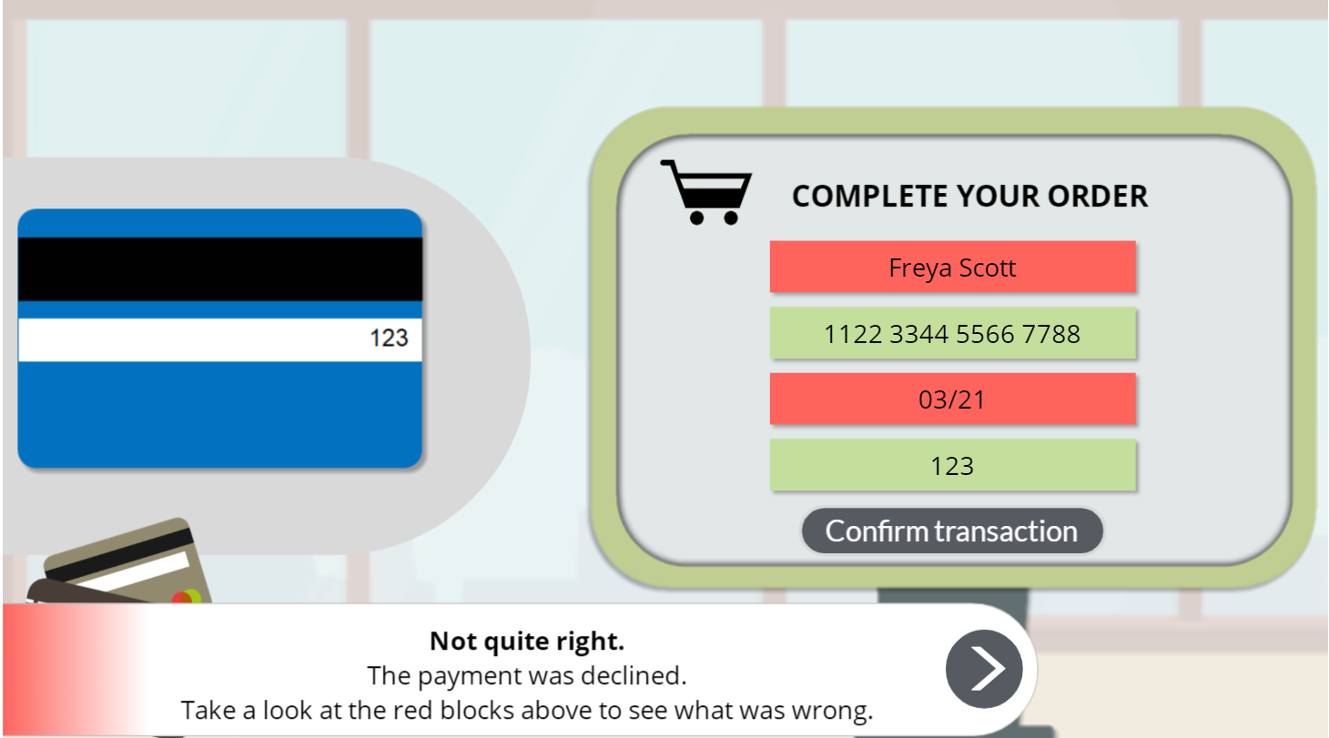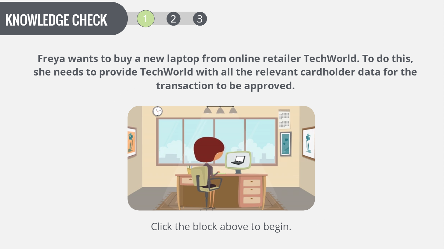 This is an extract of my work on a Payment Card Industry Standard (PCI DSS) course. This particular interaction appears in one of the knowledge checks to test and reinforce recently acquired knowledge.