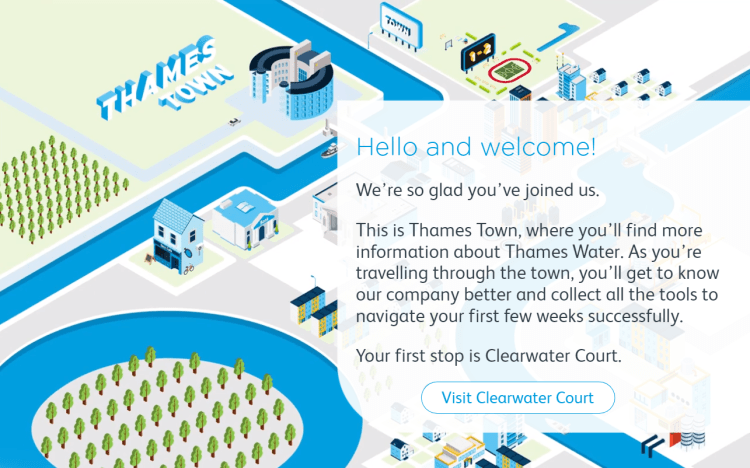 These first examples are from a suite of staff induction modules that we developed for Thames Water. We came up with the idea of Thames Town, where new employees embark on an exploration of content to learn more about who Thames Water are, what they do and their history.