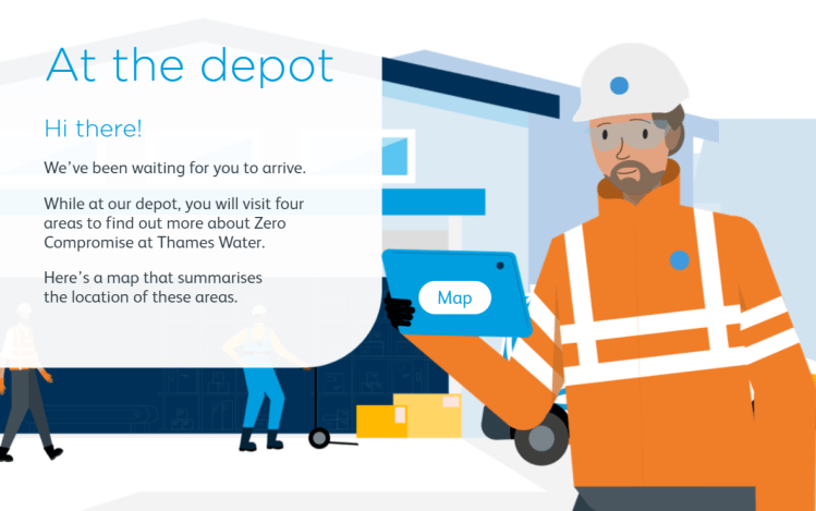 Their next stop is, Module 2, which is about health and safety, so it takes place at a Thames Water depot. The learner again is invited to travel to the depot, speak to people and interact with them. They are given a floor plan, so that they know where they should go, and they are invited to play mini-games like ‘spot the hazards’ or ‘dress the model with the correct protective equipment’.